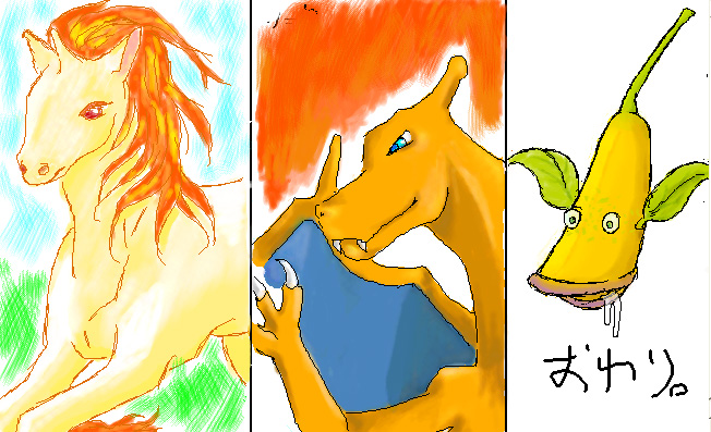 私が描いたのはギャロップです。炎ポケモンは全体的に美人が多い気がします。リザードンを描こうかと思って、でも難しそうだからと諦めたところで…隣にいるじゃん!描いてくれました。ナイス友。首のラインが美しい。うなじ美人のドラゴン…とかげ?私は問答無用でヒトカゲを選んだ小学生です。懐かしいなぁ、緑。